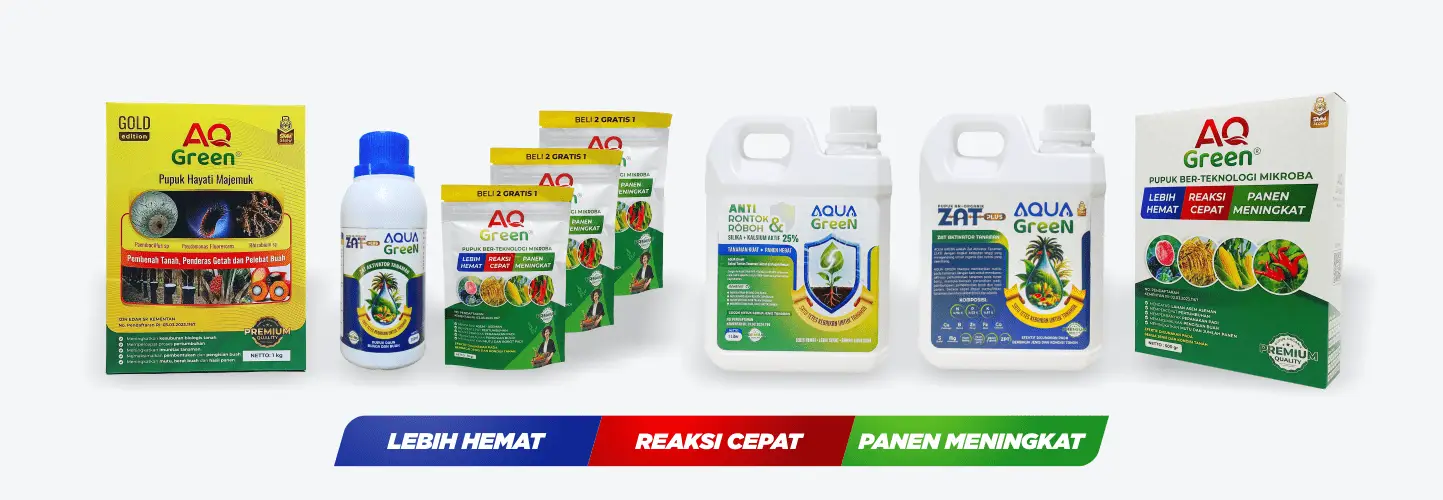 AQ Green adalah Pupuk Organik yang mengandung Microba super aktif yang dilengkapi unsur hara makro dan mikro serta ZPT (Zat Pengatur Tumbuh), Asam Amino, Asam Humat Ph12 yang berfungsi untuk pembenah tanah, meningkatkan kesuburan biologis tanah, memperbanyak akar, mempercepat proses pertumbuhan, meningkatkan imunitas tanaman, memaksimalkan pembentukan dan pengisian buah, meningkatkan mutu, berat buah, dan hasil panen.